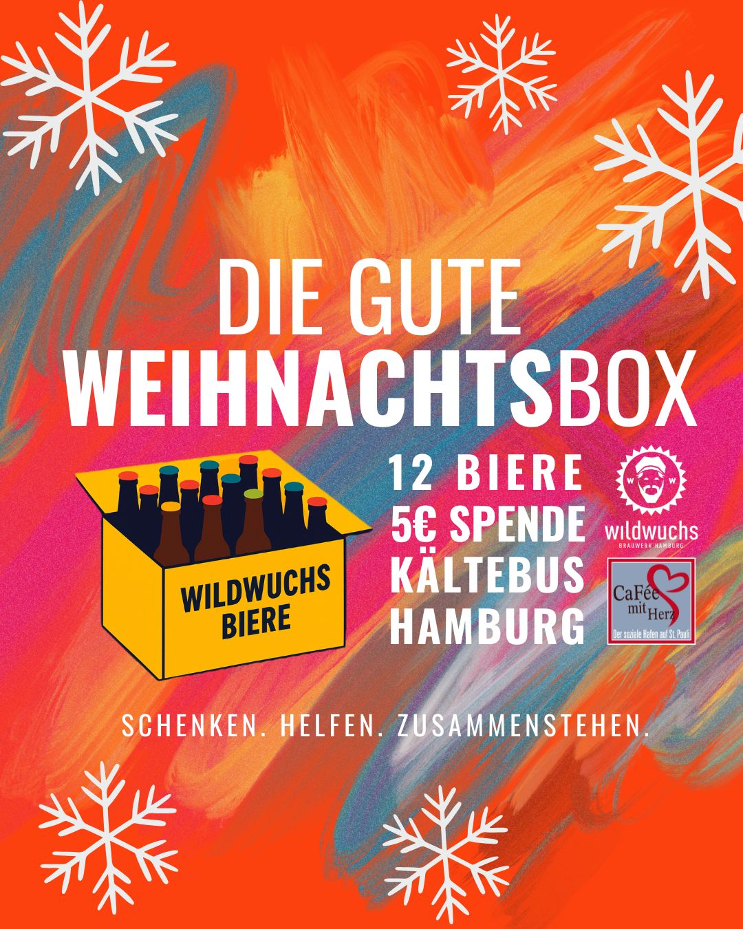 In dieser Weihnachtsbox sind nicht nur zwölf wunderbare Wildwuchs-Biere versteckt, sondern 5 € jeder Box gehen außerdem an das Projekt Kältebus Hamburg vom CaFée mit Herz.